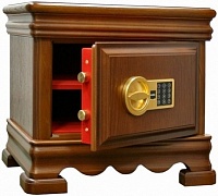 Внутри сейф изящно отделан красным бархатом, что смотрится весьма эффектно и обеспечивает вашим ценностям исключительно комфортные условия хранения. Внешняя отделка – натуральный дубовый шпон, который возможно тонировать в соответствии со стилем вашей мебели. Покрытие замка – 24-каратное золото.